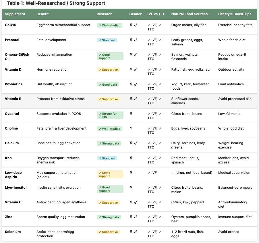 See our comprehensive table of supplements highlighting benefits, research status, gender specificity, and suitability for IVF or natural TTC, along with natural food sources and lifestyle tips to support your fertility journey.